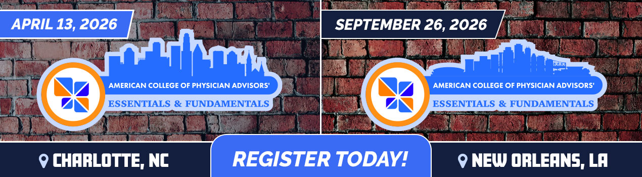 This one-day, in person event is specifically designed to cover the basics of utilization management, care management, and clinical documentation integrity. It has proven to be an excellent opportunity for new physician advisors, clinicians considering transition into this critical and dynamic administrative career, or those looking to brush-up or expand their knowledge base. Completion of Essentials & Fundamentals is also a pathway for eligibility to take the ACPA certification exam to become American College of Physician Advisors Certified (APCA-C).